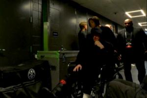 迪文岑佐坐轮椅、戴保护靴离开球馆